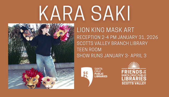During the 2024-25 school year, Kara Saki designed and built four Lion King masks for the Scotts Valley Middle School production of Lion King Jr. She received well deserved applause and recognition for her unique and marvelous creations. The Arts Commission of Santa Cruz County awarded Kara a Spotlight Award in 2025. Through the Spotlight Award, the County Arts Commission publicly recognizes individuals who have achieved a high level of excellence and creativity in their work, but who have not received widespread acknowledgment of their talent. Hot on the heels of the Spotlight Awards exhibition at the County Government Center, the Friends of the Scotts Valley Library are thrilled to present Kara’s Lion King masks in the teen area of the Scotts Valley Library.